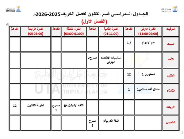 الجدول الدراسي الخاص بالفصول الأولى لفصل الخريف 2026/2025م