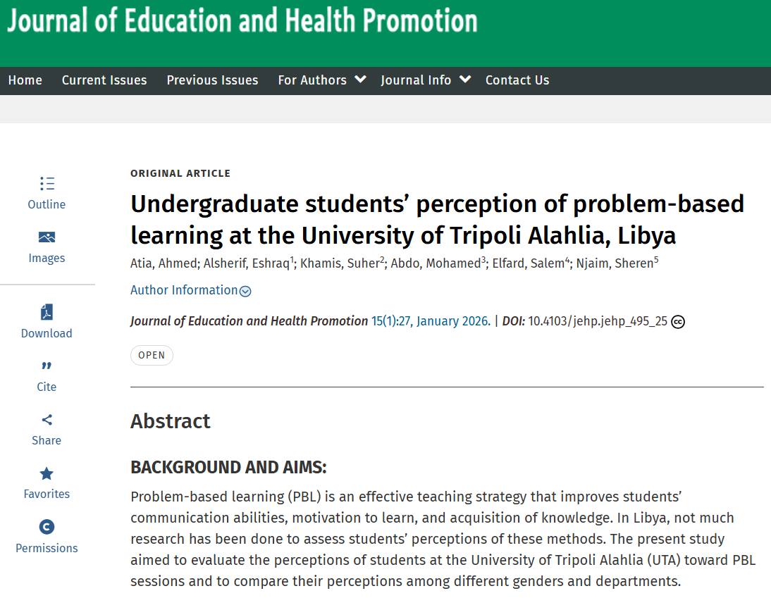 نشر بحث علمي لفريق من جامعة طرابلس الأهلية في مجلة عالمية مصنفة Q2 مفهرسة في Scopus – Web of Science – PubMed